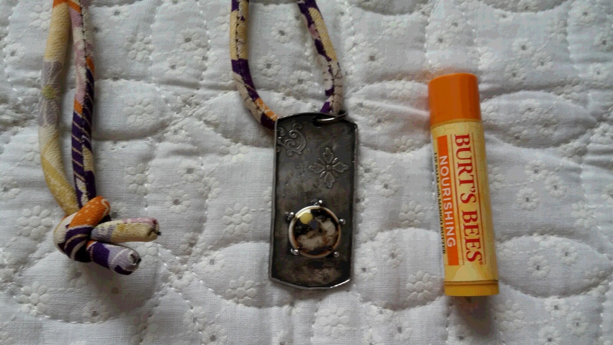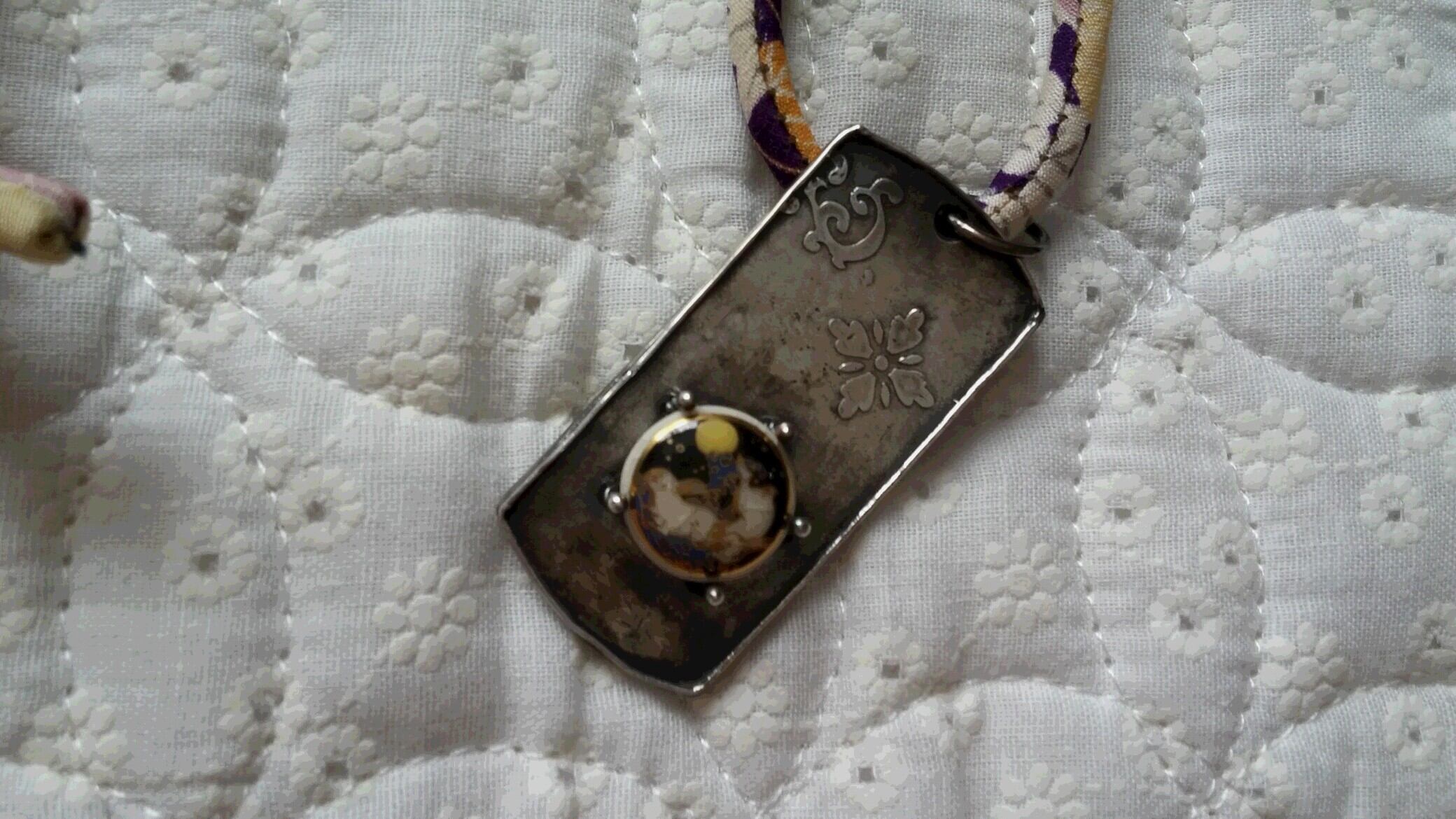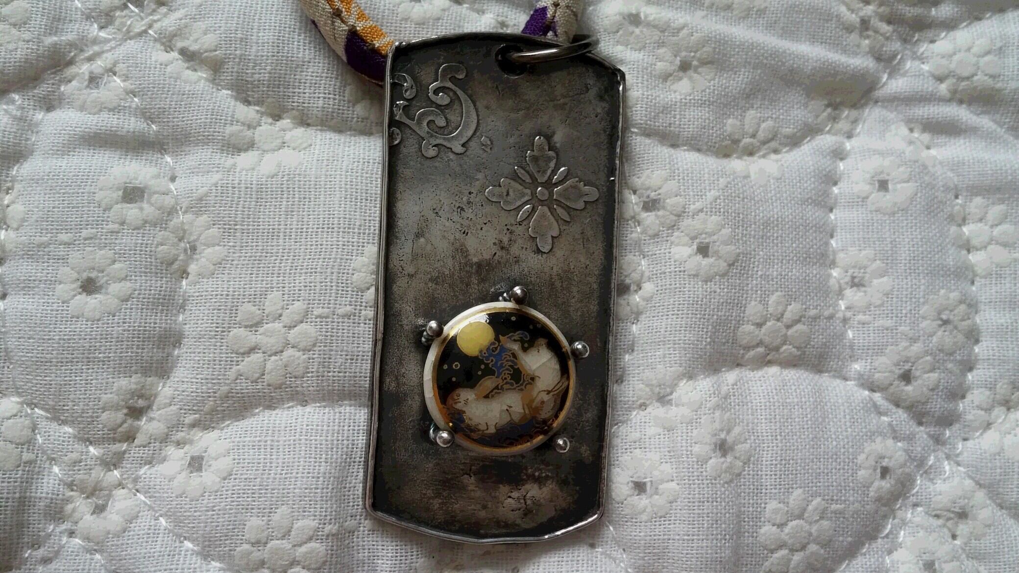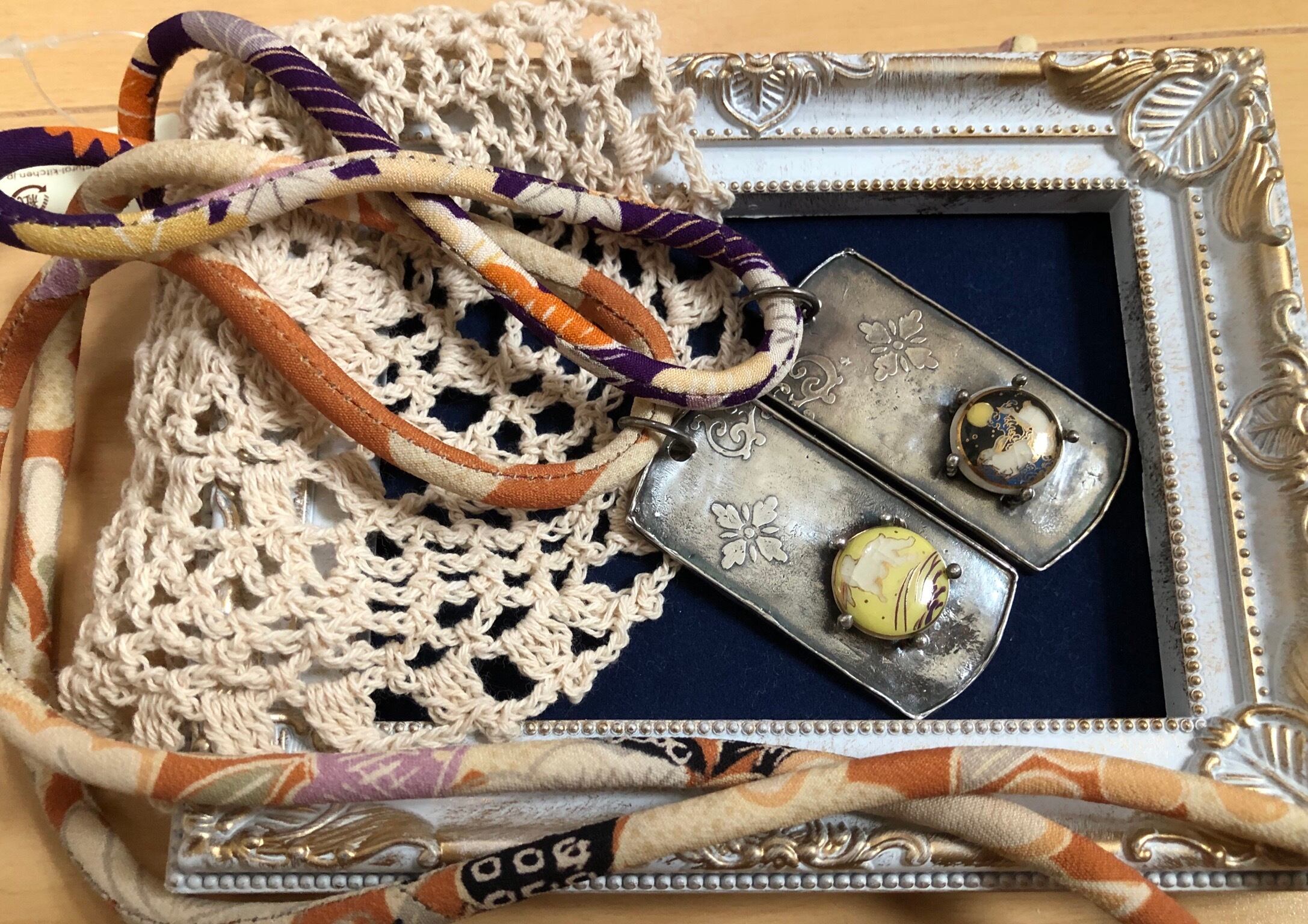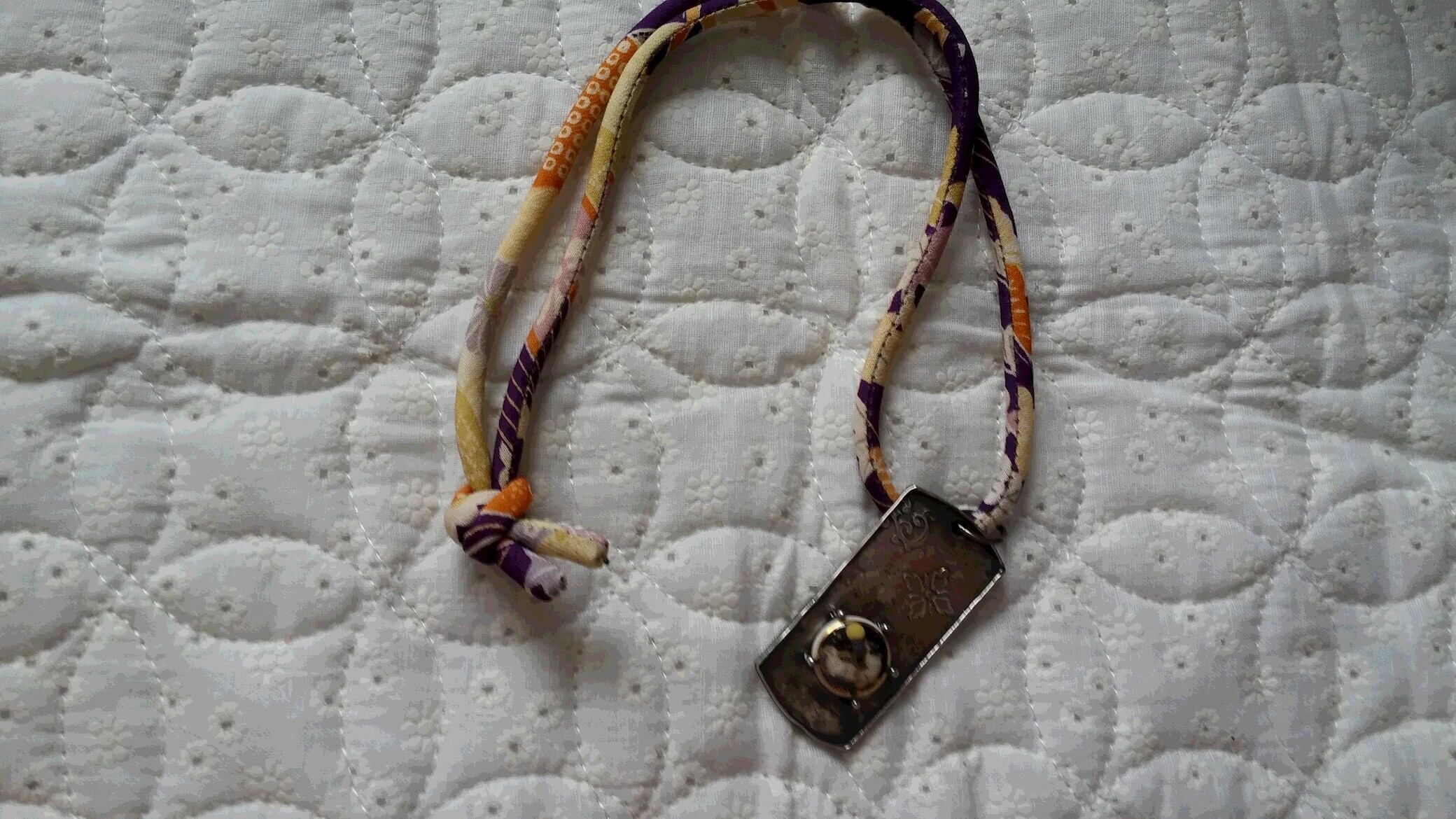 ペンダントの紐には、アンティークの着物を解いた古布で作った紐を使用しています。
