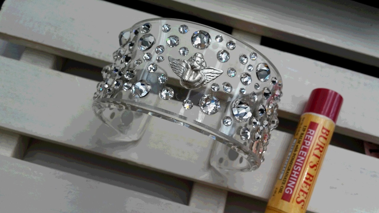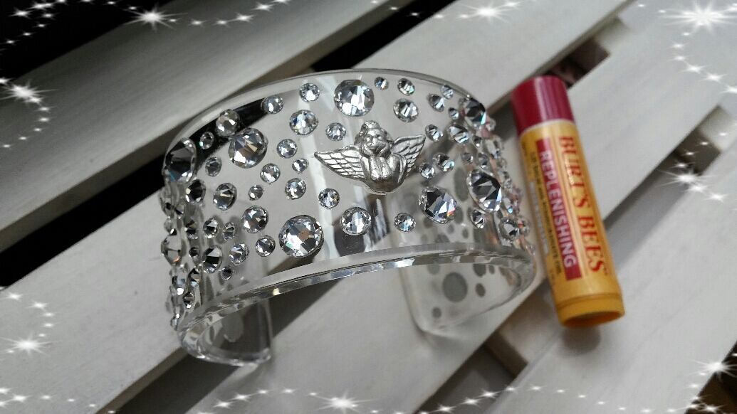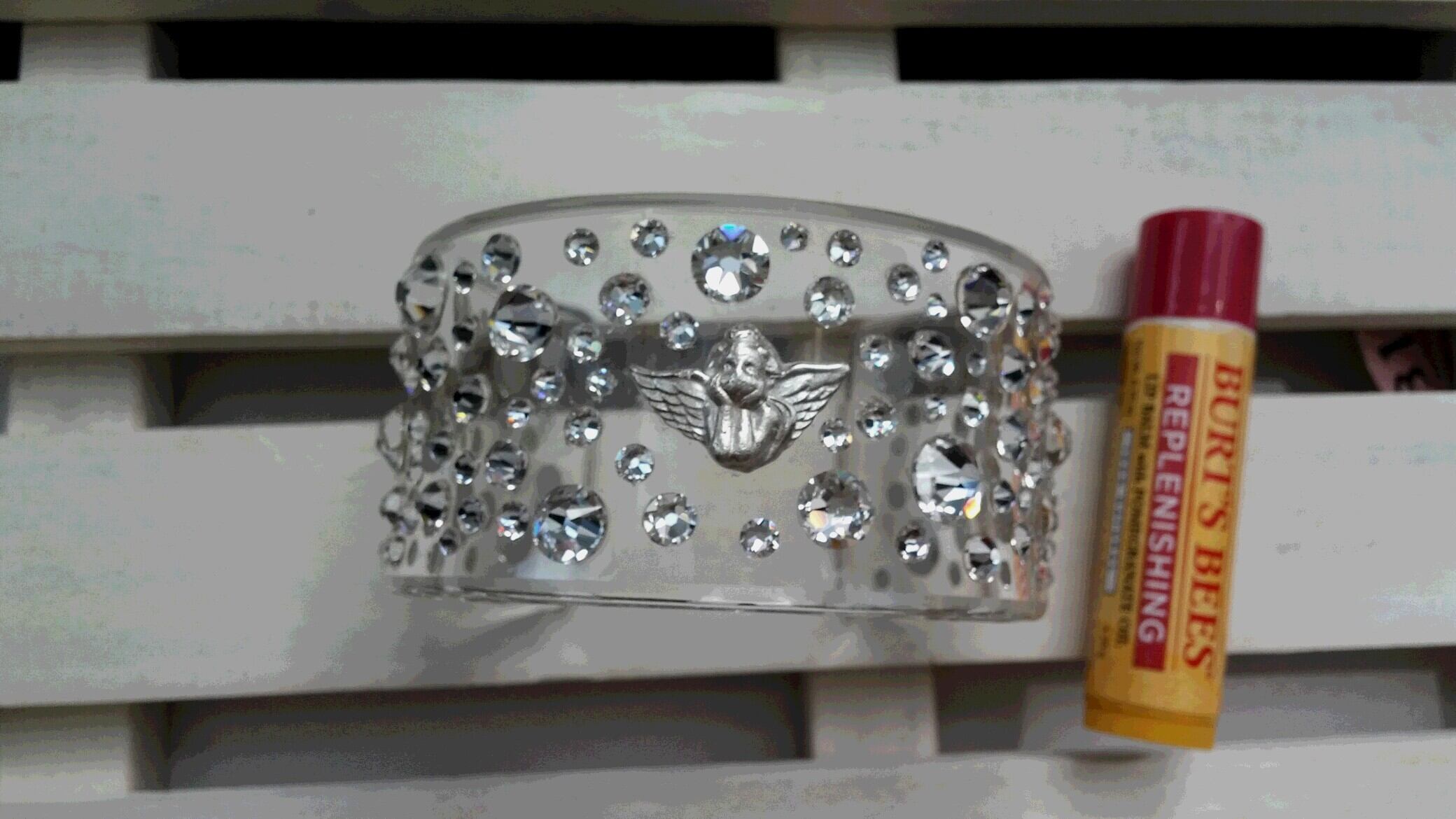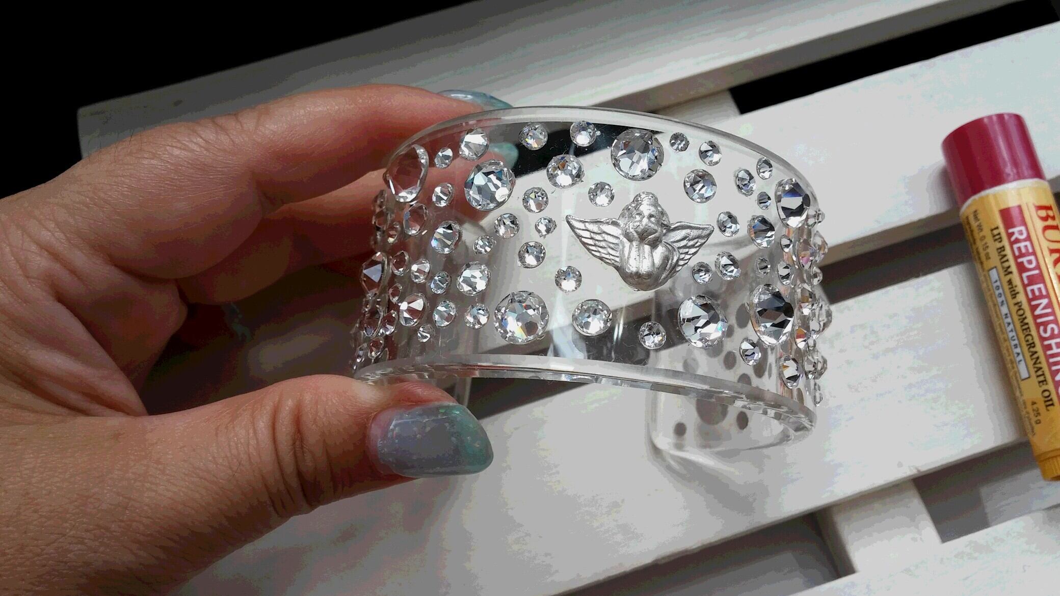 純銀の天使がバングルの上で優しく微笑み、パヴェ状に散りばめた様々なサイズのスワロフスキーがそれを囲む。
