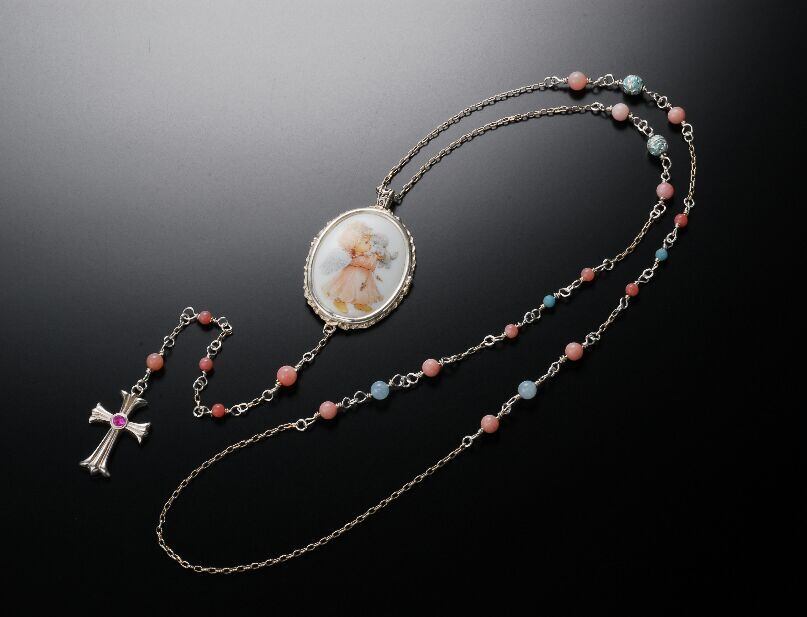 天使の絵が描かれた磁器をメダイユに見立て、天然石のビーズとシルバービーズでロザリオのようなネックレスに仕立てました。